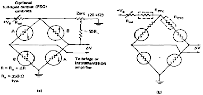 Gambar Rangkaian uji sensor tekanan strain gauge: (a) rangkaian jembatan tanpa kompensator, (b) rangkaian jembatan dengan kompensator